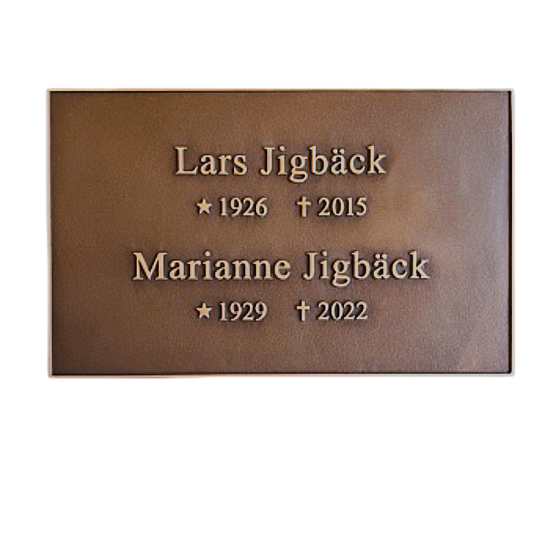 Gravskylt i brons - Klassisk med två namn är den lyxigaste och mest gedigna gravskylten gjuten i brons i högsta kvalité. Text i relief (upphöjd 1,4 mm) med tunn ram runt och plats för två namn. Stift på baksidan för beständig montering.