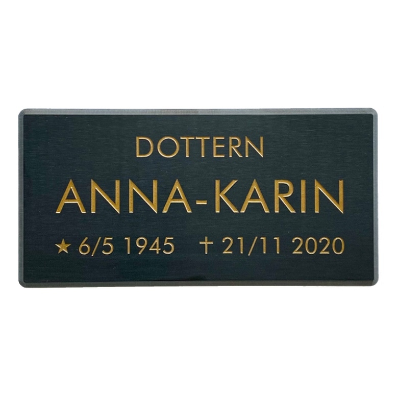Gravskylt i svart granitkomposit är en graverad skylt i 12mm matt svart granitkomposit. En vacker gravskylt för att minnas anhöriga. Texten är färgfylld med guldfärg och gravskyltens kant är mjukt fasad. Skylten monteras med lim utomhus eller med dubbelhäftande tejp inomhus. Stenkomposit är beständigt i utomhusmiljöer och kan med fördel limmas på befintliga familjegravstenar.