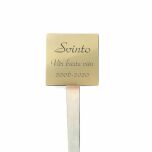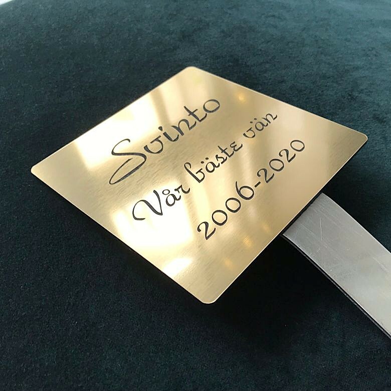 Gravskylt till djur i mässingsliknande akryl med markfäste