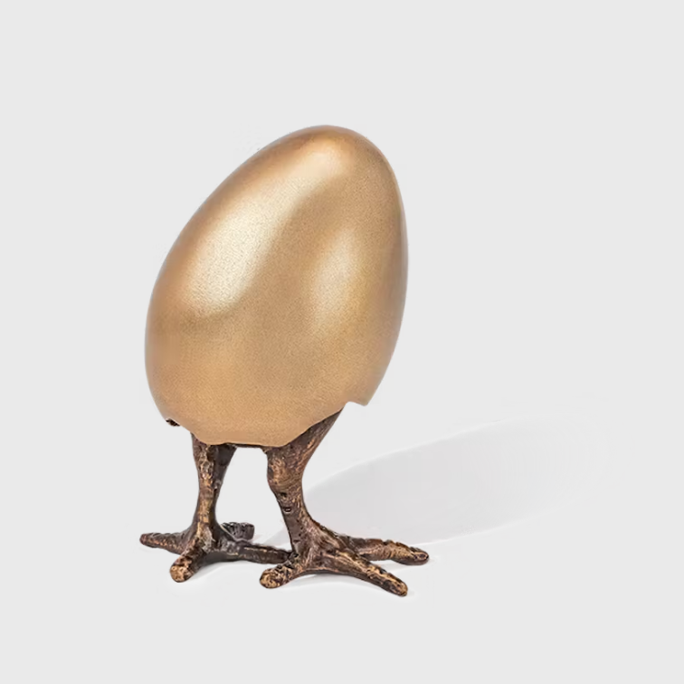 Kyckling i äggskal, På fötter, är en kyckling i kläckning som försöker ta sig ut ur sitt äggskal. Den har lyckats komma ut med fötterna först. Trädgårdskonst i gjuten brons.
