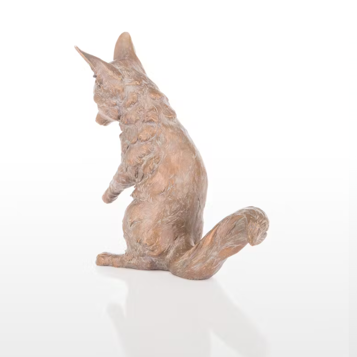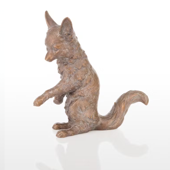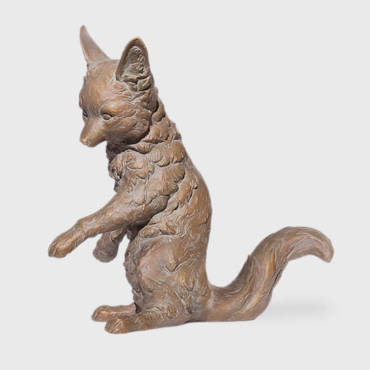 Rävunge som sitter på bakbenen. Trädgårdskonst i gjuten brons. En liten räv som passar tillsammans med övriga rävungar i vårt sortiment, samt med Räv Stående och Räv Liggande.