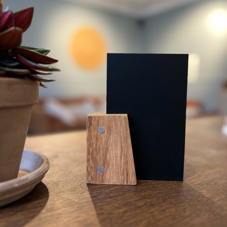 Skylthållare med rustik känsla i trä. Skylthållaren är en perfekt lösning både för informationsdisken och för att användas som bordsryttare med menykort osv.