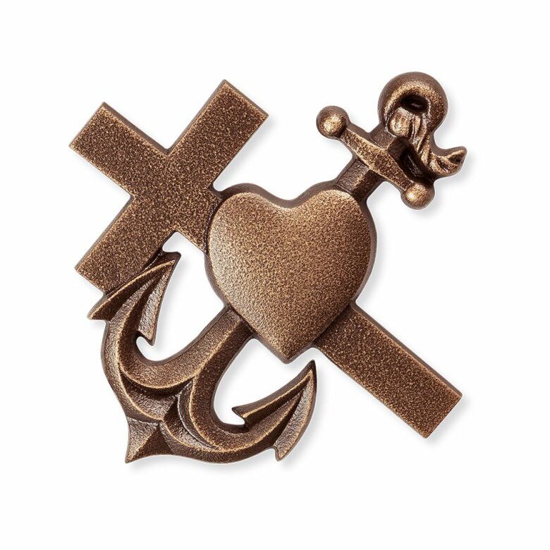 Symbolerna för tro, hopp och kärlek i gjuten brons eller aluminium, relieffigur. Konstnärlig dekoration till gravsten. Storlek: 8 x 8 x 1 cm. Fristående med gängade stift på undersidan. Kan med fördel monteras på en befintlig gravsten.